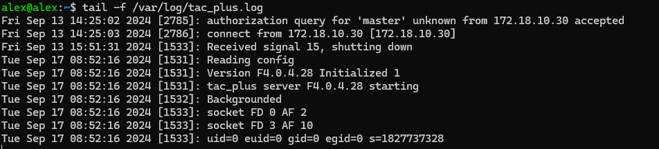 sudo tac_plus -C /etc/tacacs+/tac_plus.conf -t -d 1checking log